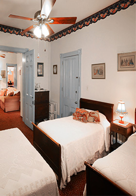 The Filomena Suite is tastefully appointed with both antique and contemporary furniture, handmade curtains, drapes and Victorian lampshades. The kitchen features an antique oak dining room set and antique highchair. The 50-spring Victorian couch in the living room was lovingly hand-upholstered (300 hours+).